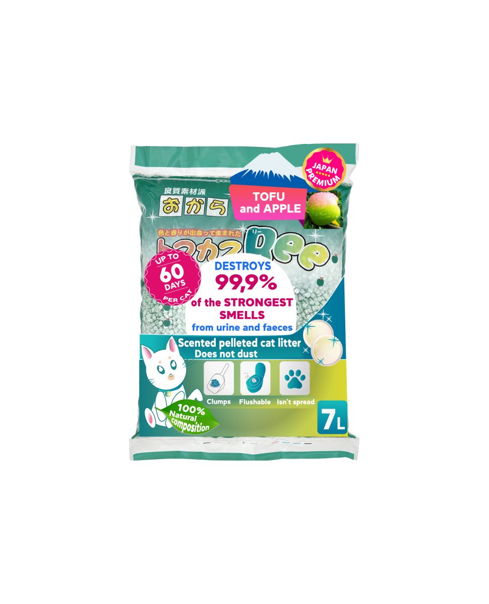 Destruye los olores más fuertes de orina y excrementos. Tiene un efecto antibacteriano mejorado. Absorbe grandes cantidades de líquido rápidamente. Momifica las heces. No genera polvo (incluso si el gato está cavando activamente). No se propaga en las patas. Apto para ser desechado en el inodoro.. Relleno vegetal a base de Tofu con un delicado aroma a manzana. El tofu es el campeón absoluto en absorbencia entre todas las fibras vegetales (capaz de absorber hasta 9 veces su propio peso). Los flavonoides naturales y las catequinas del té japonés tienen altas propiedades antibacterianas y destruyen la fuente del olor desagradable: las bacterias. Gracias a esto y al delicado aroma del melocotón, elimina los olores más fuertes de orina y heces, y además aromatiza la estancia. La catequina del té japonés + los aceites esenciales cubren la superficie de las heces y bloquean el olor en el interior. Esta propiedad única nos permitió resolver el problema de las visitas repetidas a la bandeja por parte de mascotas exigentes con la limpieza y la frescura de la bandeja. Tiene gránulos bastante pesados que no generan polvo, incluso si el gato cava activamente. Su forma y pulido especial evitan que la mascota se desgarre las patas y el pelaje de la mascota. Gracias al uso exclusivo de agentes naturales su composición, es ideal para mascotas y dueños propensos a reacciones alérgicas. Volumen: 7 litros. Volumen: 7 litros.