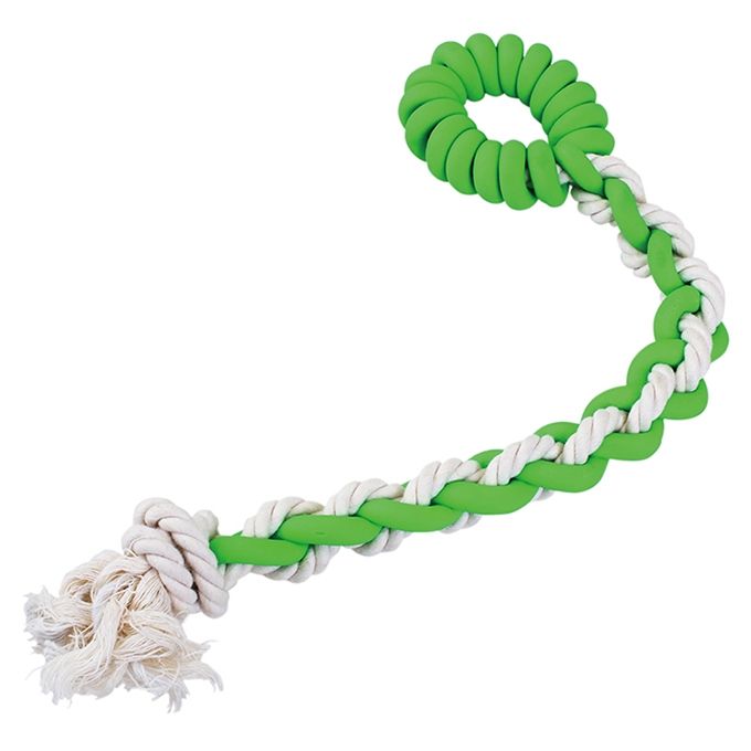 La corde hybride procure du plaisir lorsque deux matériaux différents mordent en même temps et aide à prévenir le tartre. - Un jouet brillant et polyvalent pour l'hygiène bucco-dentaire. - Fabriqué en latex naturel et en coton à forte armure. Les fibres du fil de coton éliminent délicatement et en douceur la plaque dentaire, tandis que le latex masse doucement les gencives. - Ce jouet a été conçu pour répondre aux besoins des chiens aux gencives fragiles. Les chiens actifs adoreront l'expérience du "tir à la corde". - Recommandé par les vétérinaires japonais.