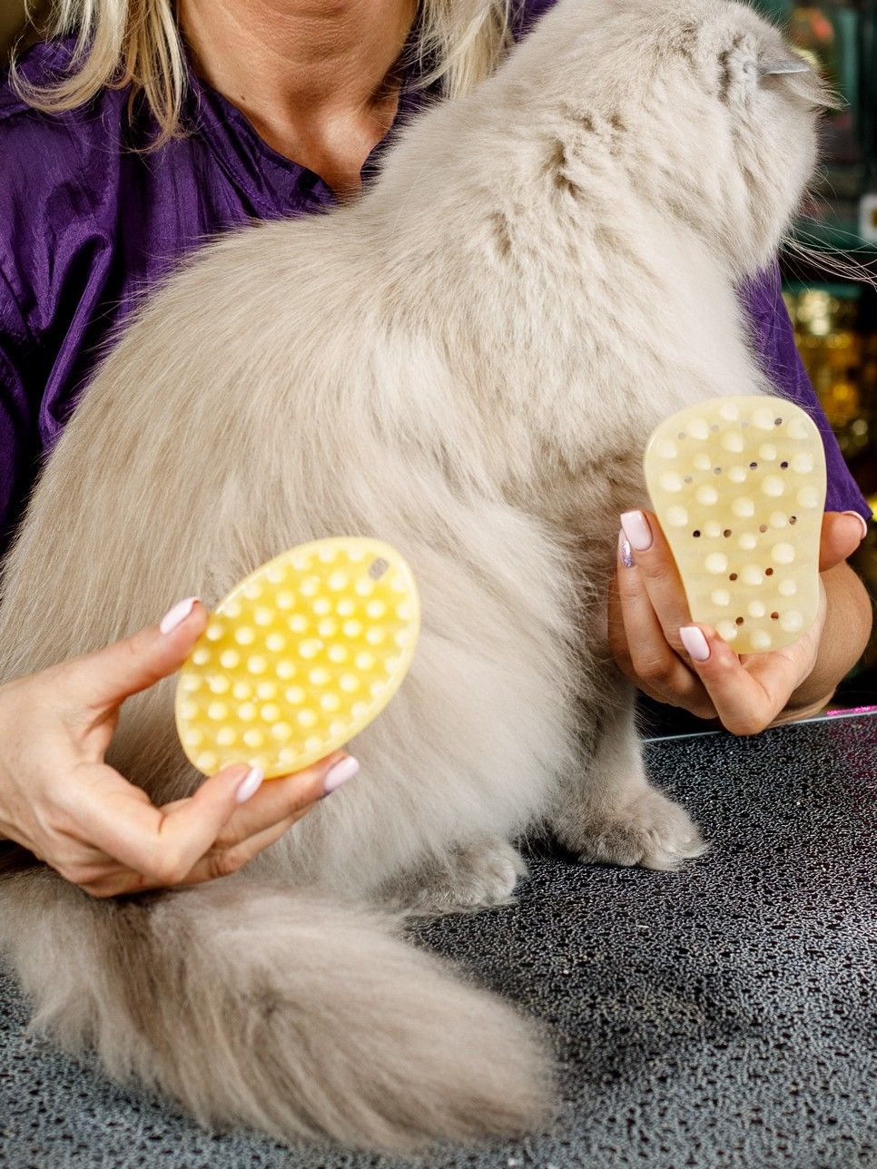 Brosse ultra-silicone pour enlever les poils moyens et longs avec fonction de bain supplémentaire. Universel pour chiens et chats Super pratique pour chiens et chats de bain. Il y a des trous dans la brosse pour le passage de l'eau. Ultra-silicone avec une structure extra douce affecte non seulement la peau, mais aussi les poils de l'animal pendant le bain, éliminant efficacement la saleté. Efficace aussi pour enlever la laine délavée. Longueur 10 cm, largeur 7 cm.