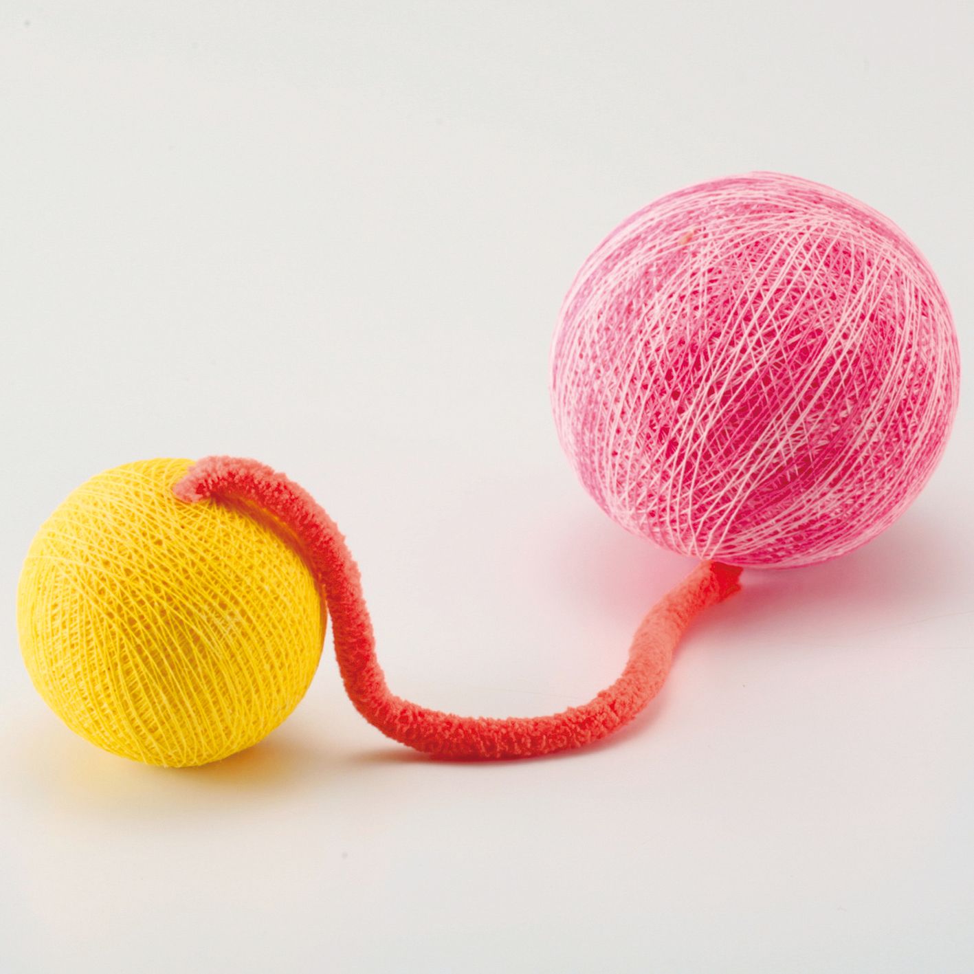 Powierzchnia kulek pokryta jest nitkami, które z łatwością przyczepiają się do kocich pazurów. Próbując wyrzucić jedną kulkę z pazurów, kot wprawia w aktywny ruch drugą piłkę, co drażni zwierzaka. Zabawka nie pozostawi obojętnym nawet najspokojniejszego pupila. Materiał: bawełna, poliester, klej lateksowy, proszek ryżowy, folia aluminiowa.