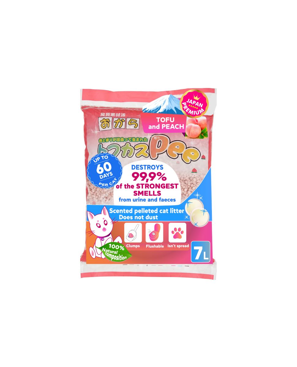 Niszczy najsilniejsze zapachy moczu i odchodów. Ma wzmocnione działanie antybakteryjne. Szybko wchłania duże ilości cieczy. Mumifikuje kał. Nie generuje kurzu (nawet jeśli kot aktywnie kopie). Nie rozprowadza się na łapach. Wpadł do toalety. Wypełniacz roślinny na bazie Tofu o delikatnym aromacie brzoskwini. Tofu jest absolutnym mistrzem chłonności wśród wszystkich włókien roślinnych (zdolny do wchłonięcia do 9-krotności swojej wagi). Naturalne flawonoidy i japońskie katechiny herbaciane mają wysokie właściwości antybakteryjne, niszcząc źródło nieprzyjemnego zapachu - bakterie. Dzięki temu oraz delikatnemu aromatowi brzoskwini niweluje najsilniejsze zapachy moczu i kału, a także aromatyzuje pomieszczenie. Japońska herbata katechina + olejki eteryczne pokrywają powierzchnię kału i blokują zapach w środku. Ta wyjątkowa właściwość pozwoliła nam rozwiązać problem wielokrotnych wizyt na tacy przez zwierzaki, które są wybredne w kwestii czystości i świeżości kuwety. Ma dość ciężkie granulki, które nie generują kurzu, nawet jeśli kot aktywnie kopie. Ich kształt oraz specjalne polerowanie zapobiegają rozrywaniu pupila na łapach i sierści pupila. Dzięki zastosowaniu w składzie wyłącznie naturalnych składników jest idealny dla zwierząt domowych i właścicieli podatnych na reakcje alergiczne. Pojemność: 7 litrów. Pojemność: 7 litrów.